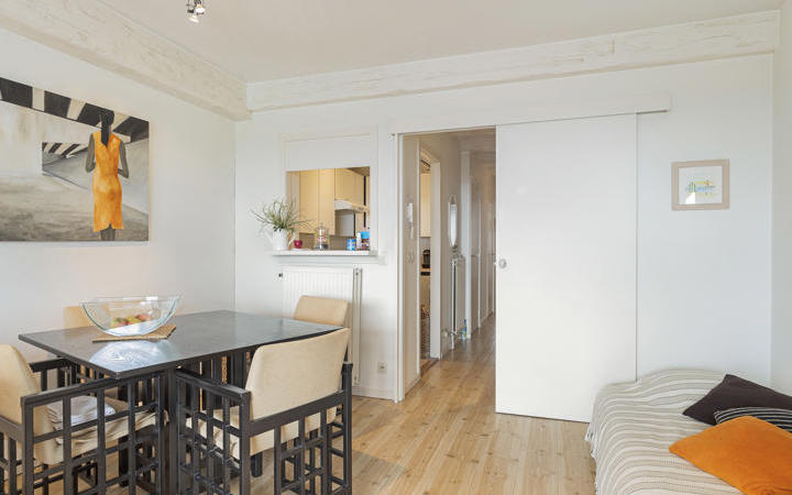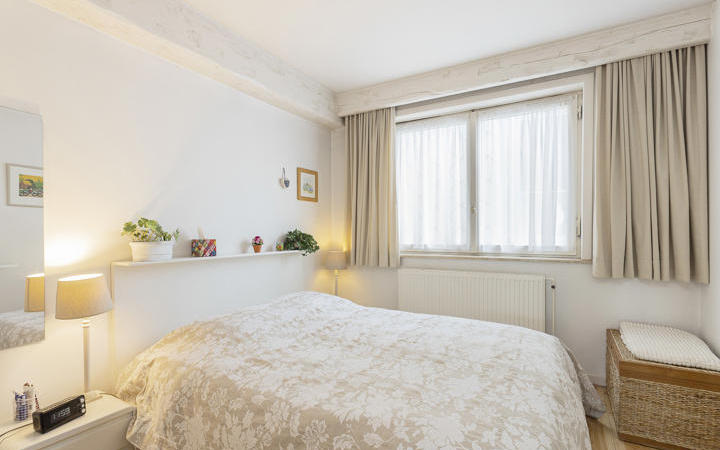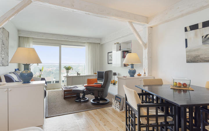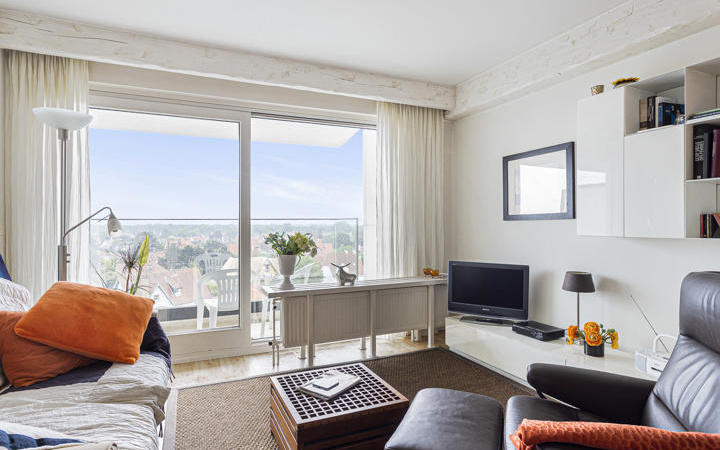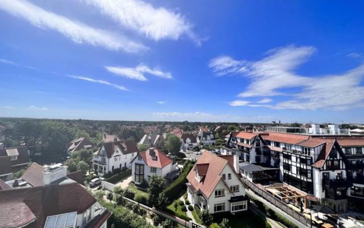Appartement pratique et lumineux avec vue dégagée sur les villas du Zoute, à deux pas de la place Albert. Composition : entrée avec toilette. Vaste séjour et salle à manger avec porte coulissante ouvrant sur belle terrasse plein sud. Cuisine américaine royalement équipée. Chambre à coucher avec beaucoup d'armoires encastrées. Salle de douche. Cave privée. Possibilité d'achat d'un garage à quelques pas de la résidence. Visites volontiers après rendez-vous en nos bureaux