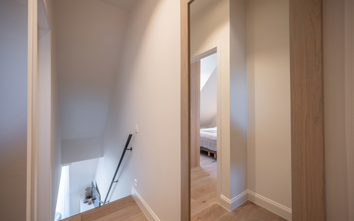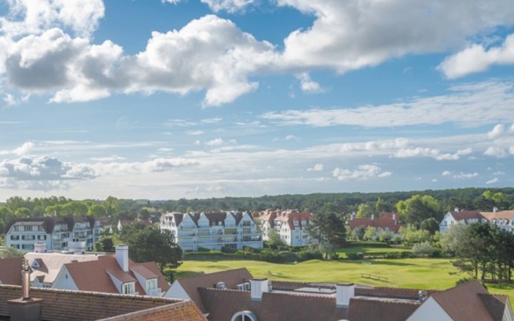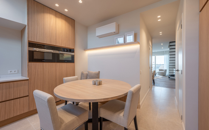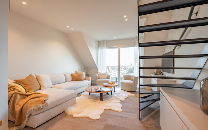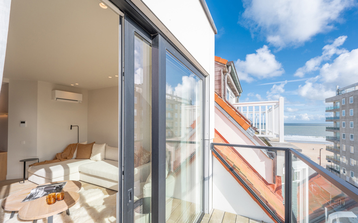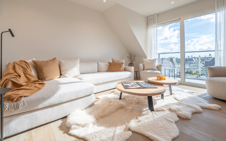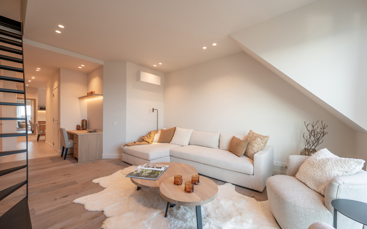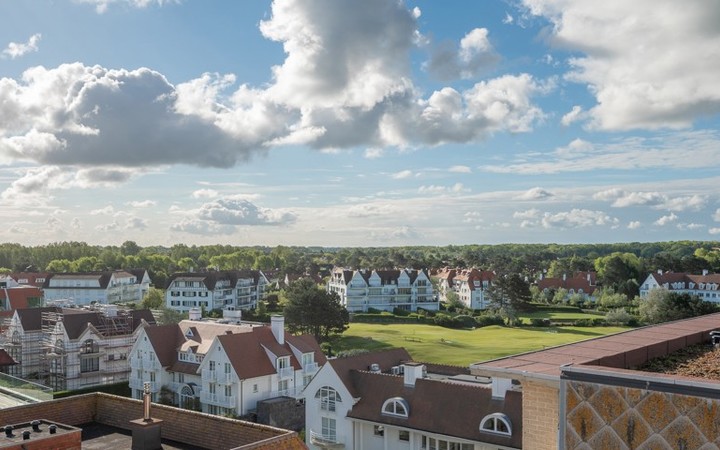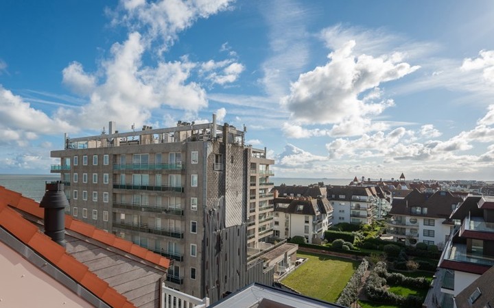 Penthouse en duplex nouvellement construit, entre la digue et l’avenue Littorale, au cœur du Zoute avec belle terrasse, vue sur mer et vue sur le minigolf. Composition: hall d'entrée avec vestiaire, bureau et wc. Séjour lumineux avec armoires encastrées, accès direct à la terrasse, avec vue mer et vue sur le minigolf. Cuisine semi-ouverte entièrement équipée (appareils Miele) et raccordement pour lave-linge et séchoir. A l'étage : chambre principale avec armoires encastrées. Salle de douche séparée (douche à l'italienne, lavabo et WC). 2ème chambre à coucher avec armoires encastrées. Possibilité d'achat du mobilier et d’un garage à proximité immédiate de l'appartement. Division de la valeur du terrain et de la construction (nouvelle construction). Visites volontiers après rendez-vous en un de nos bureaux.