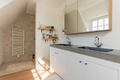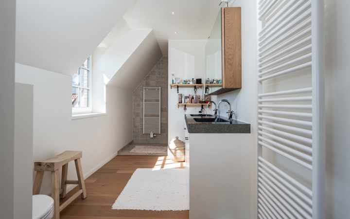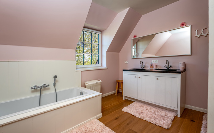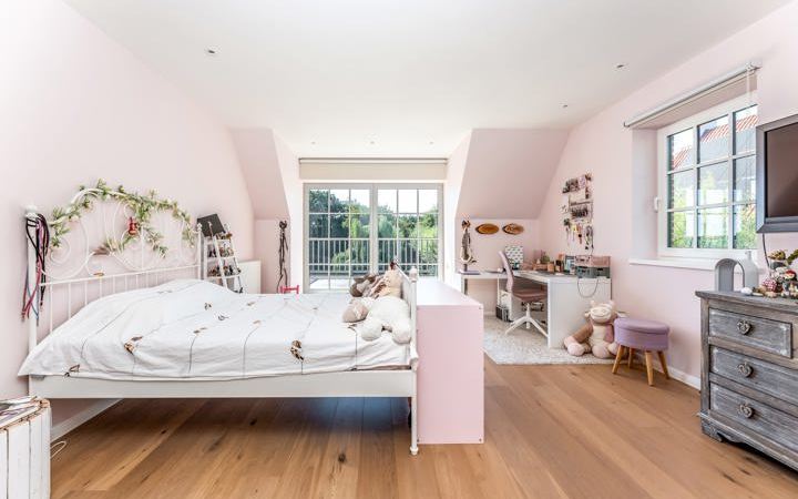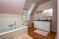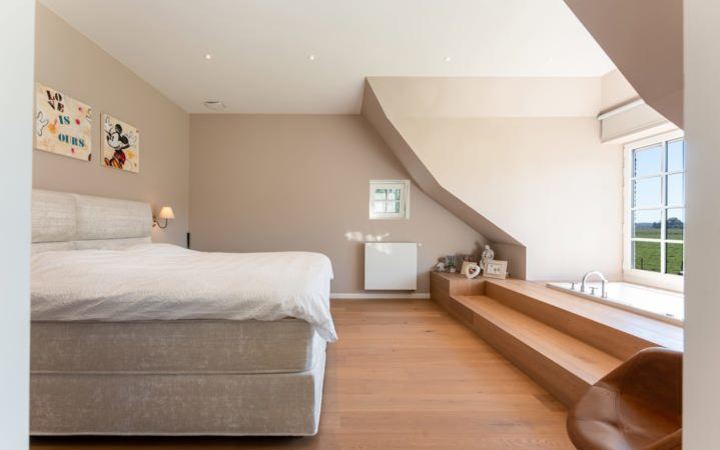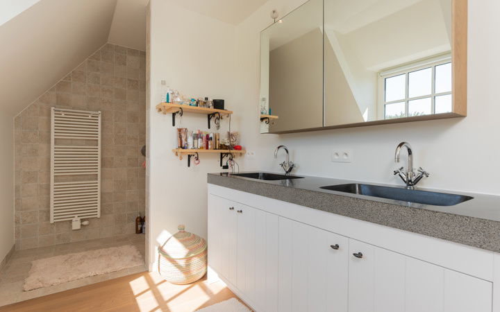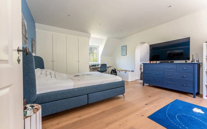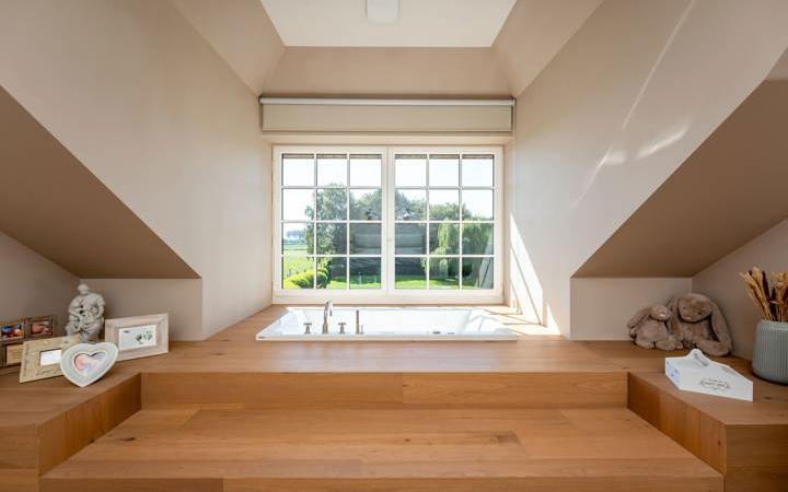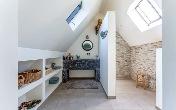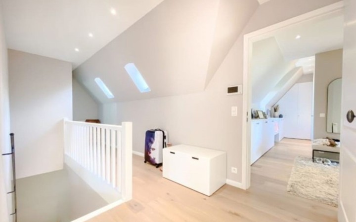 À l’étage : la chambre principale est un véritable coup de cœur, avec un spacieux dressing "walk-in" et une salle de bains en suite luxueuse, équipée de double vasque, douche à l’italienne et toilettes. Dans la chambre elle-même, une baignoire encastrée a été intégrée, offrant une vue imprenable sur le jardin. L’étage dispose également d’une deuxième chambre avec une grande terrasse privée et sa propre salle de bains avec baignoire, douche à l’italienne, lavabo et toilettes. La troisième chambre, également complète, dispose elle aussi de sa propre salle de bains avec douche à l’italienne, lavabo et toilettes. Le grenier offre la possibilité d’aménager une quatrième chambre ou un espace de vie supplémentaire.