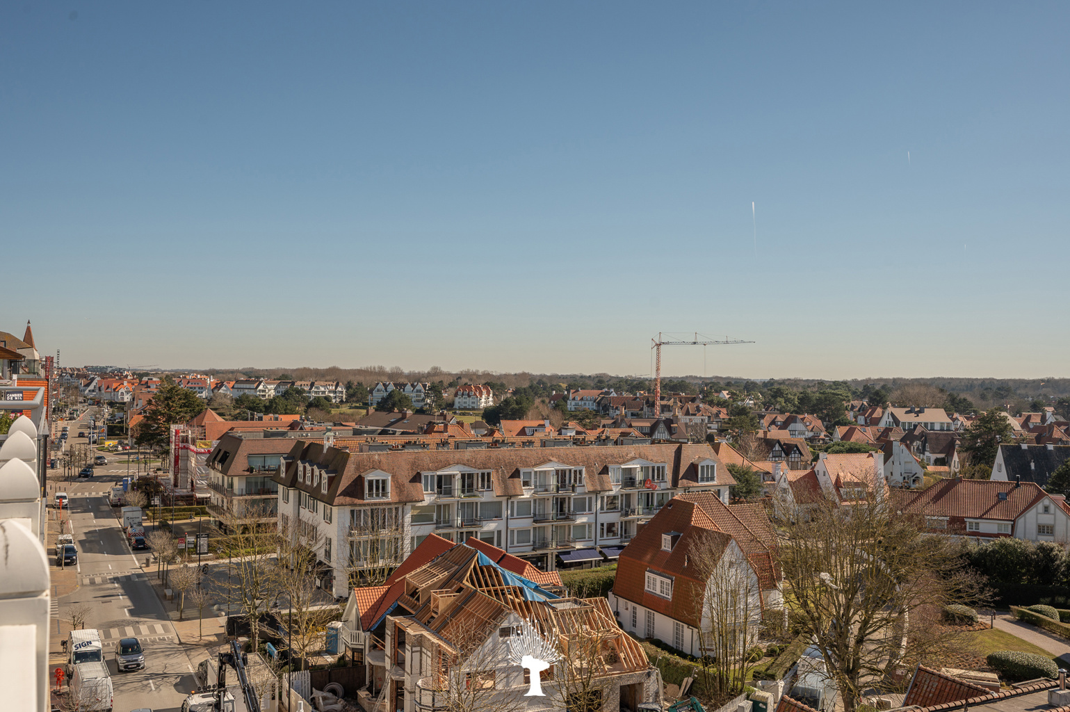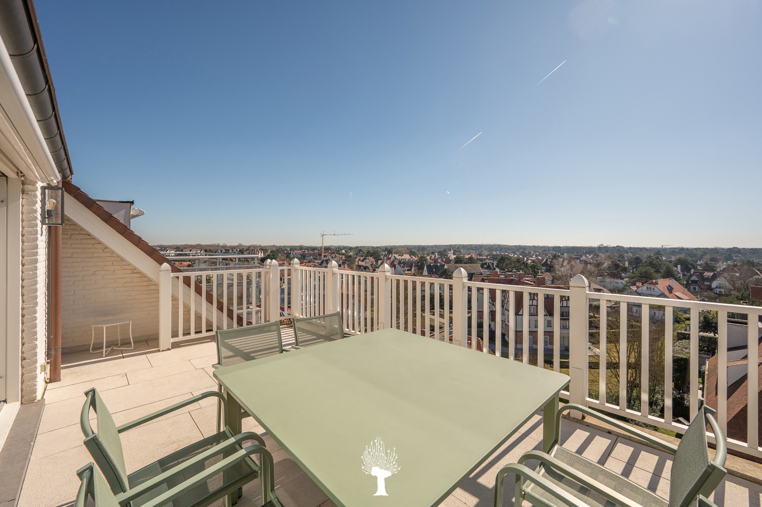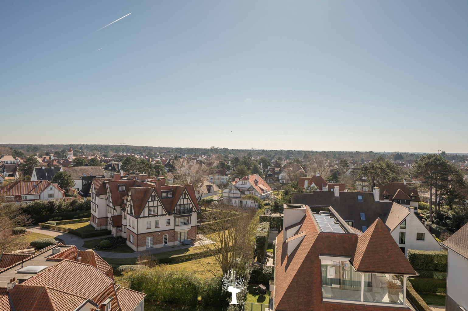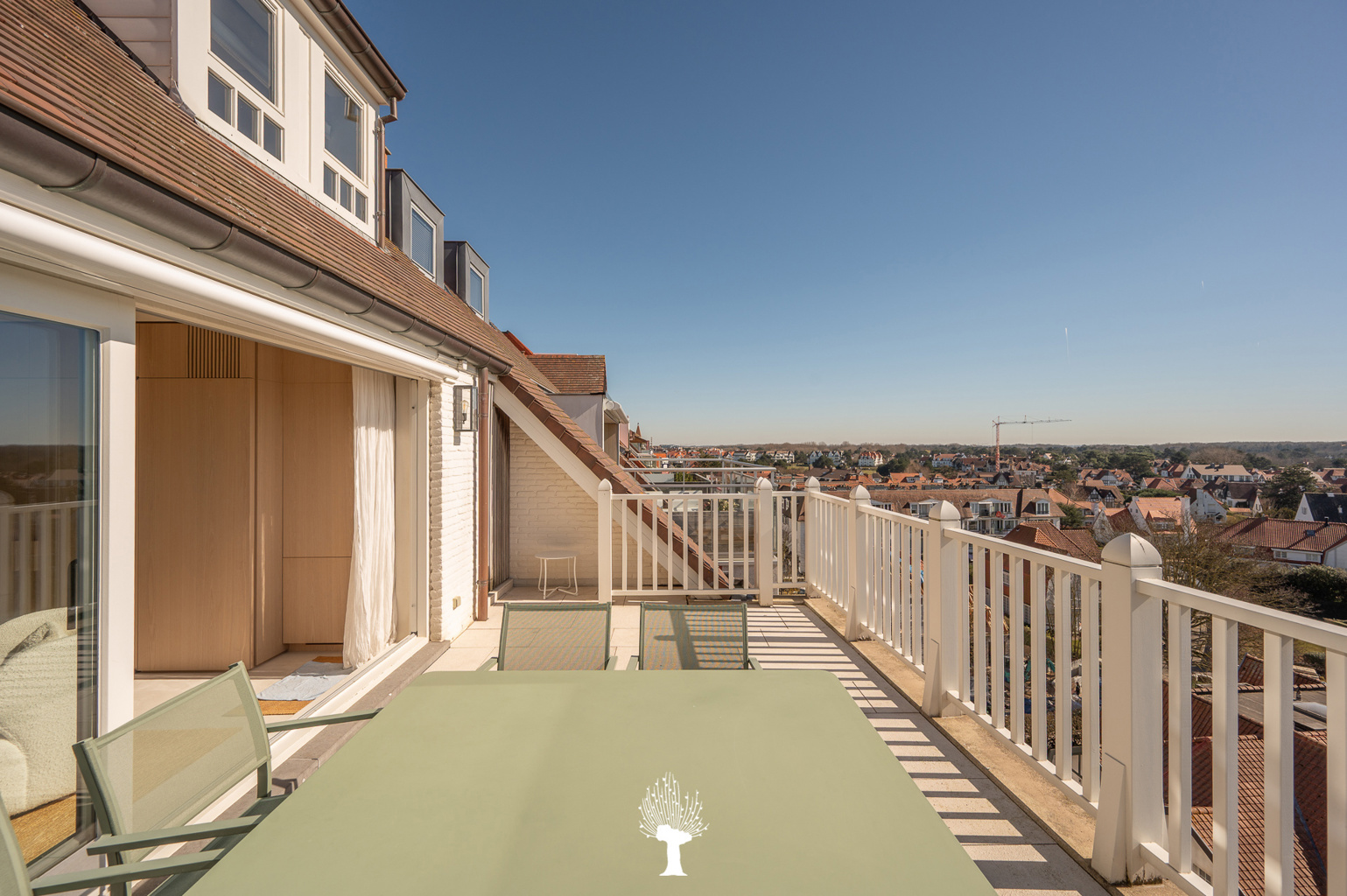 Recent gerenoveerde penthouse met groot terras en schitterend panoramisch vergezicht over de villa's van het Zoute. Indeling: inkomhall met vestiaire en wc. Grote lichtrijke woon- en eetkamer uitgevend op uitzonderlijk groot zuidgericht terras. Open, volledig geïnstalleerde, keuken met aansluitende praktische bijkeuken/wasplaats. Op de bovenliggende verdieping: hoofdslaapkamer met veel ingemaakte kasten en aansluitende badkamer (inloopdouche, wc, lavabo). 2de volwaardige slaapkamer met ingemaakte kasten. Aparte douchekamer (douche, lavabo). 3de volwaardige slaapkamer met ingemaakte kasten, bureel, ligbad en lavabo. Nachttoilet. Recente renovatie by Nathalie Deboel. 1 Grote privé kelder. Mogelijkheid tot overname huur van 1 garagebox in de Residentie Val Riant. Bezoek gaarne na afspraak via één van onze kantoren.