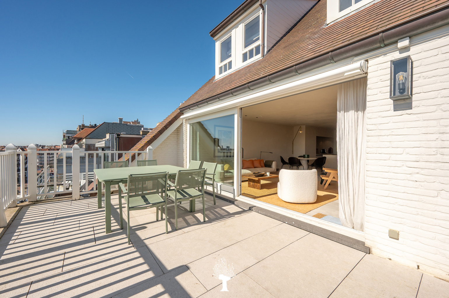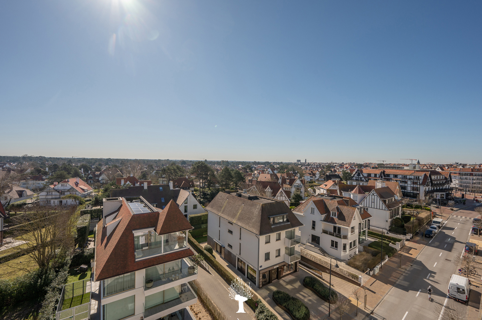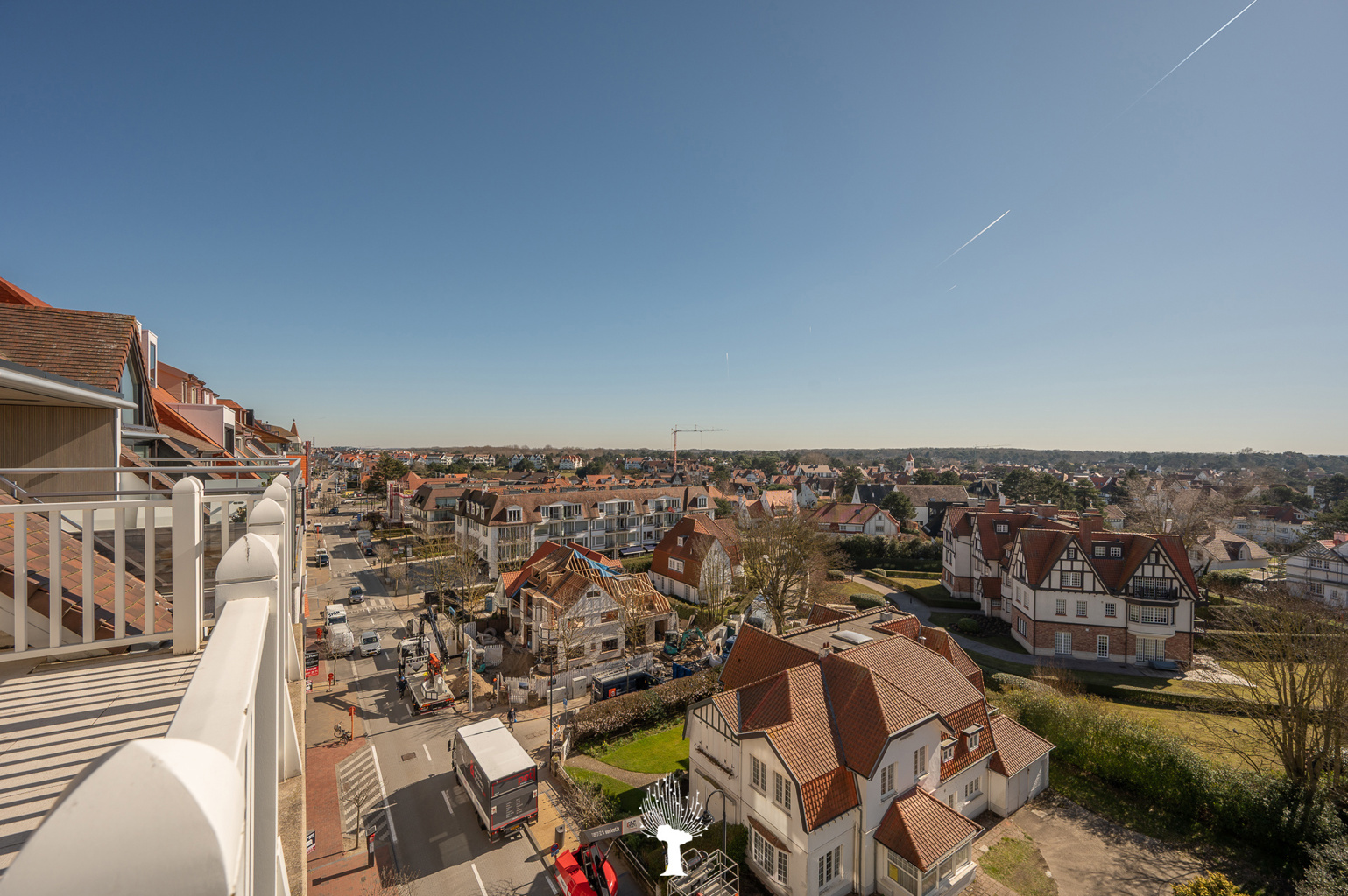 Recent gerenoveerde penthouse met groot terras en schitterend panoramisch vergezicht over de villa's van het Zoute. Indeling: inkomhall met vestiaire en wc. Grote lichtrijke woon- en eetkamer uitgevend op uitzonderlijk groot zuidgericht terras. Open, volledig geïnstalleerde, keuken met aansluitende praktische bijkeuken/wasplaats. Op de bovenliggende verdieping: hoofdslaapkamer met veel ingemaakte kasten en aansluitende badkamer (inloopdouche, wc, lavabo). 2de volwaardige slaapkamer met ingemaakte kasten. Aparte douchekamer (douche, lavabo). 3de volwaardige slaapkamer met ingemaakte kasten, bureel, ligbad en lavabo. Nachttoilet. Recente renovatie by Nathalie Deboel. 1 Grote privé kelder. Mogelijkheid tot overname huur van 1 garagebox in de Residentie Val Riant. Bezoek gaarne na afspraak via één van onze kantoren.
