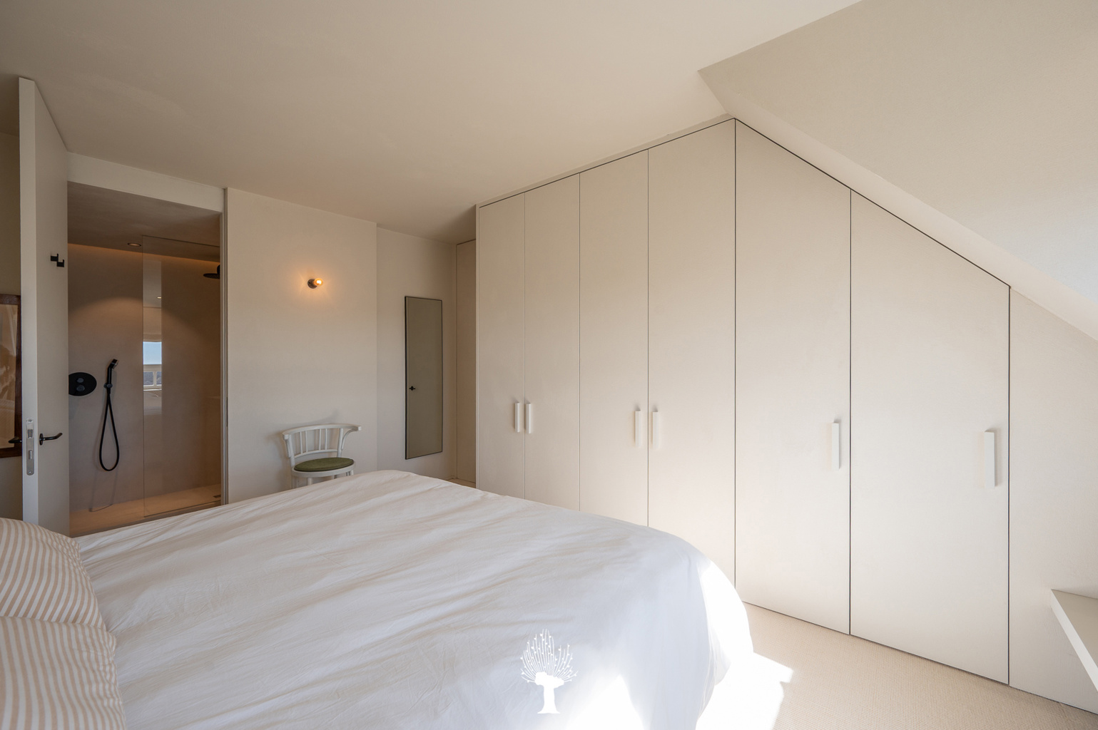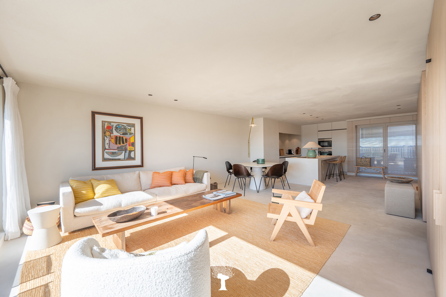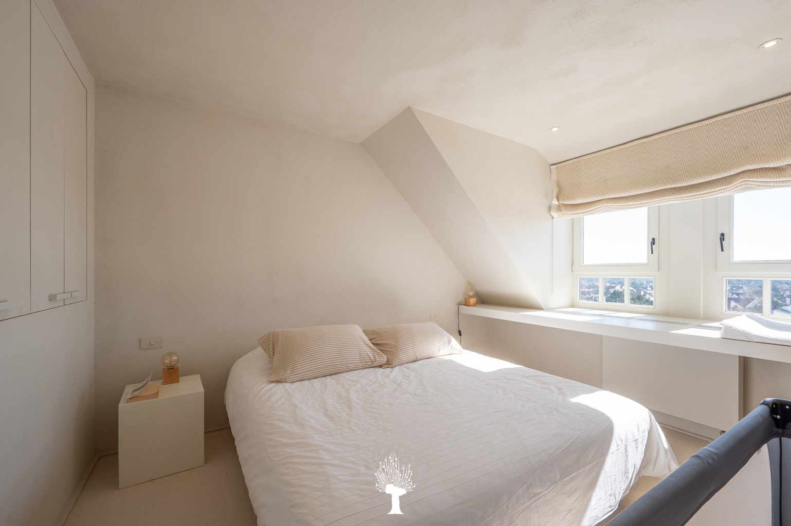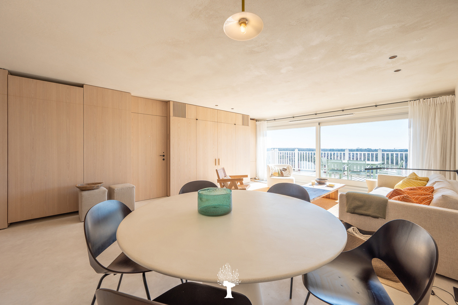 Recent gerenoveerde penthouse met groot terras en schitterend panoramisch vergezicht over de villa's van het Zoute. Indeling: inkomhall met vestiaire en wc. Grote lichtrijke woon- en eetkamer uitgevend op uitzonderlijk groot zuidgericht terras. Open, volledig geïnstalleerde, keuken met aansluitende praktische bijkeuken/wasplaats. Op de bovenliggende verdieping: hoofdslaapkamer met veel ingemaakte kasten en aansluitende badkamer (inloopdouche, wc, lavabo). 2de volwaardige slaapkamer met ingemaakte kasten. Aparte douchekamer (douche, lavabo). 3de volwaardige slaapkamer met ingemaakte kasten, bureel, ligbad en lavabo. Nachttoilet. Recente renovatie by Nathalie Deboel. 1 Grote privé kelder. Mogelijkheid tot overname huur van 1 garagebox in de Residentie Val Riant. Bezoek gaarne na afspraak via één van onze kantoren.