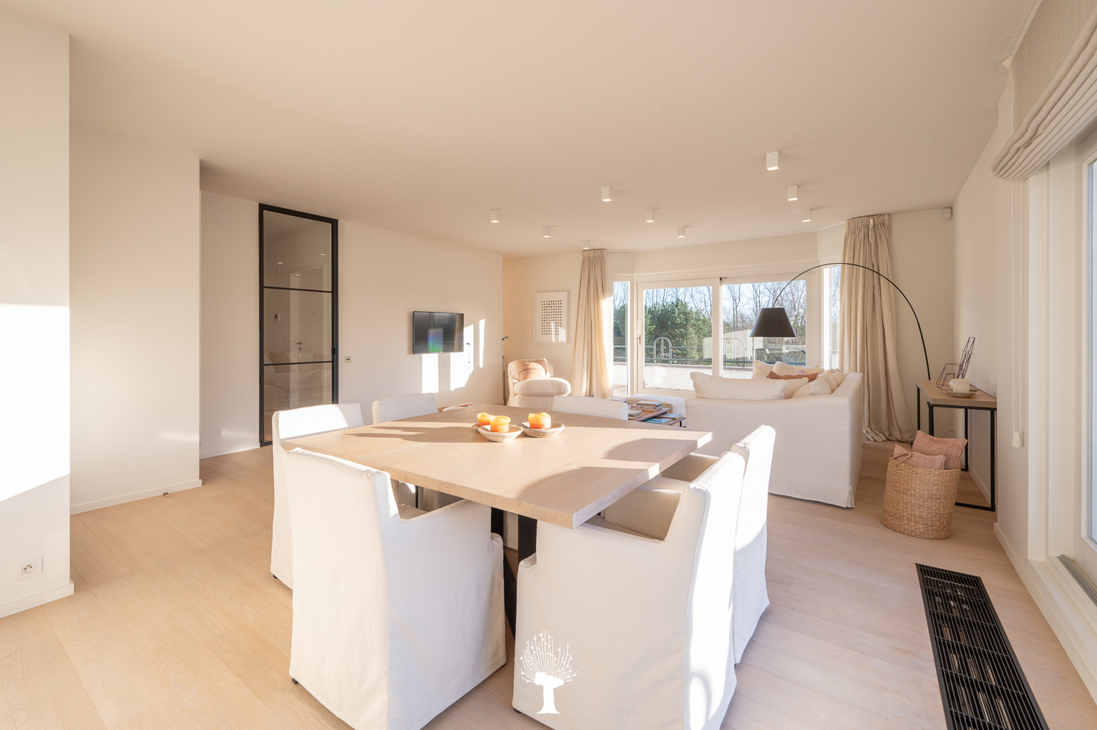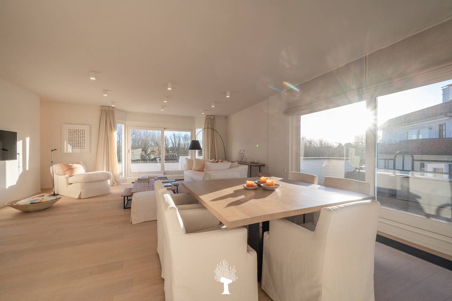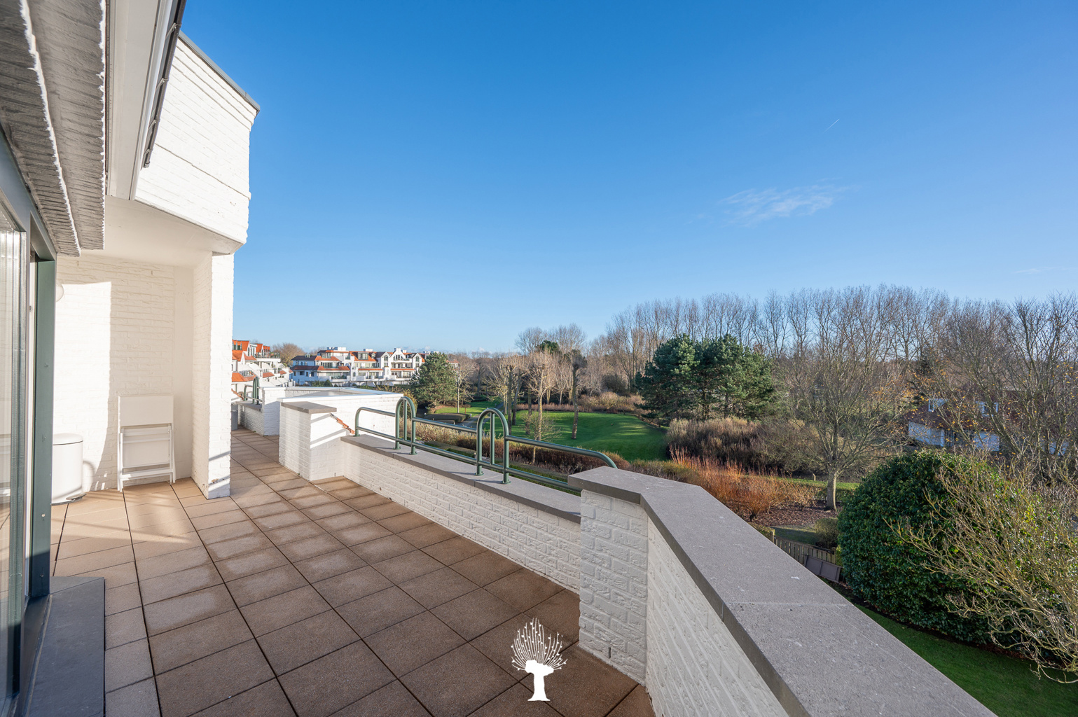 Prachtig hoekappartement met maar grote zonneterrassen.Indeling: directe toegang tot het appartement vanuit de lift. Inkom met vestiaire en gastentoilet. Ruime woon- en eetkamer met toegang tot twee ruime, zonnige terrassen met een uniek uitzicht op het domein. Moderne open keuken, uitgerust met toestellen van Miele en uitzicht op zee. Via de nachthal bereikt u 3 ruime slaapkamers, elk met een dubbel bed en ingebouwde kasten, en elk met toegang tot een van de terrassen. De masterbedroom heeft een eigen badkamer, voorzien van een ligbad, dubbele lavabo, inloopdouche en toilet. De twee andere slaapkamers delen een douchekamer met inloopdouche en lavabo. Er is een afzonderlijke grote bergruimte, waar onder andere de technische installaties en aansluitingen voor wasmachine/droogkast zich bevinden. Privatieve kelder. Gemeenschappelijke fietsenberging. Domeinopzichter: maximale veiligheid en service. Meerdere buitenstaanplaatsen voor bezoekers. Mogelijkheid tot aankoop van een autostaanplaats in de residentie. Bezoek gaarne na afspraak in één van onze kantoren.