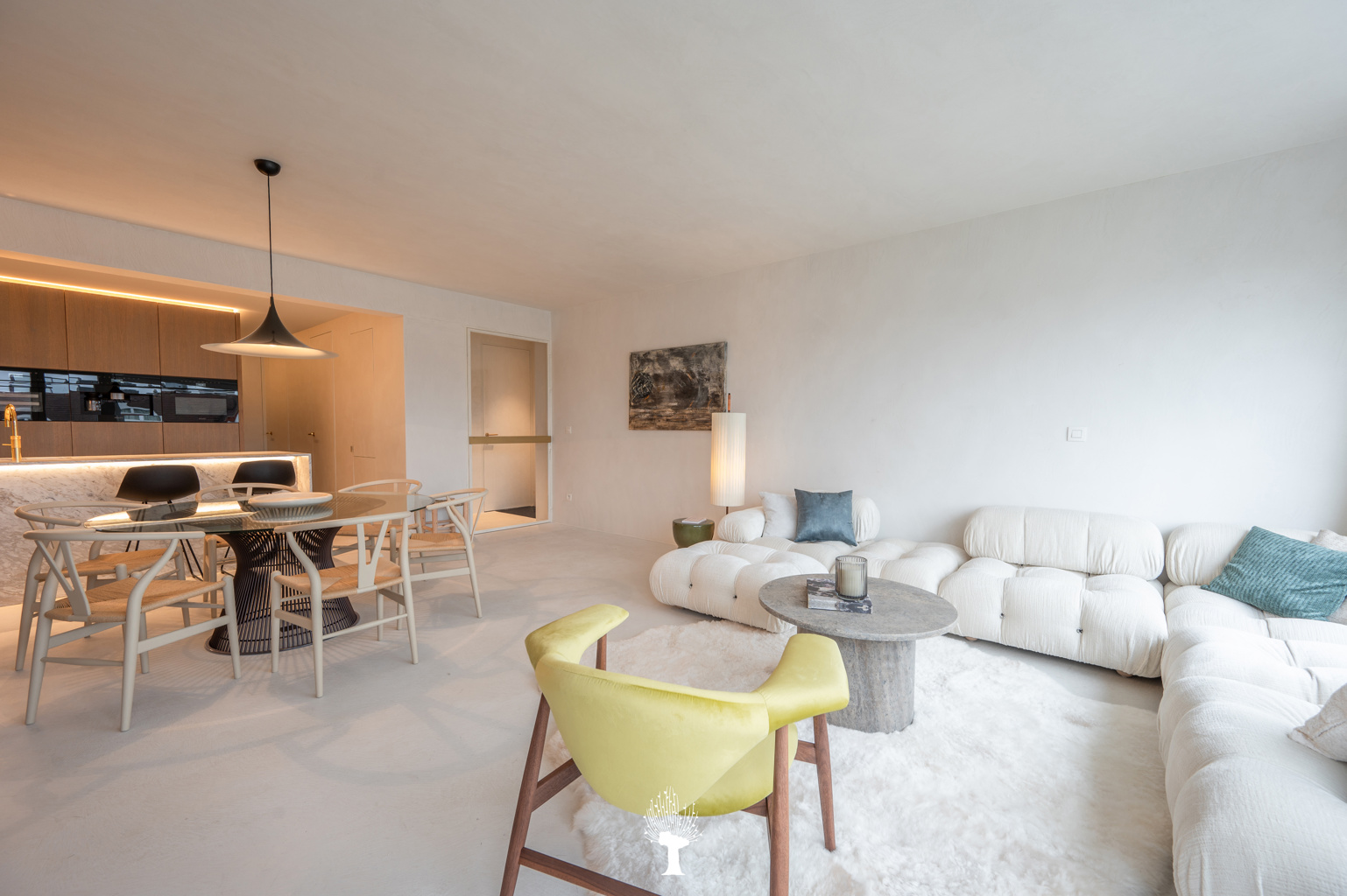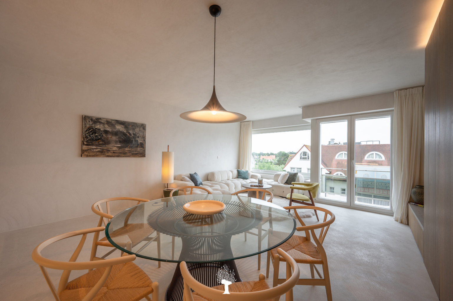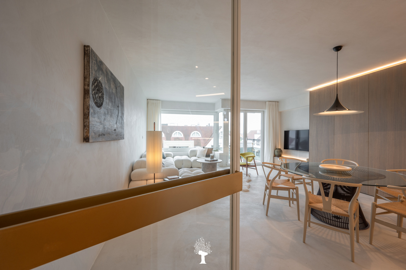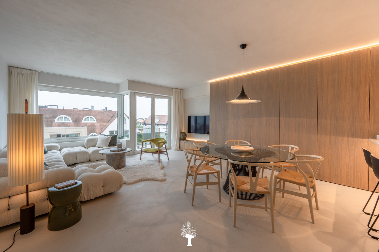 Stijlvol gerenoveerd appartement in het Zoute met Zuidgerichte leefruimte met open zicht op de minigolf. Indeling: Inkom, lichtrijke woon- en eetkamer met grote raampartijen, volledig ingerichte open keuken (Miele-toestellen), 2 ruime slaapkamers met ingemaakte kasten en tv-aansluiting waarvan 1 met douche. Derde kleinere slaapkamer. Aparte douchekamer. Privatieve kelder en gemeenschappelijke fietsenberging. Mogelijkheid tot aankoop van een garage in de nabije omgeving. Bezoek en bijkomende informatie gaarne na afspraak via één onze kantoren.