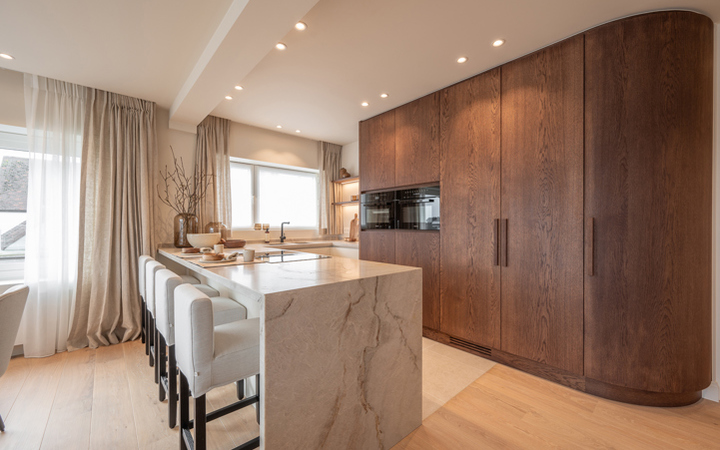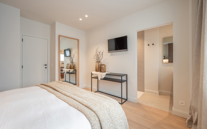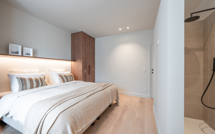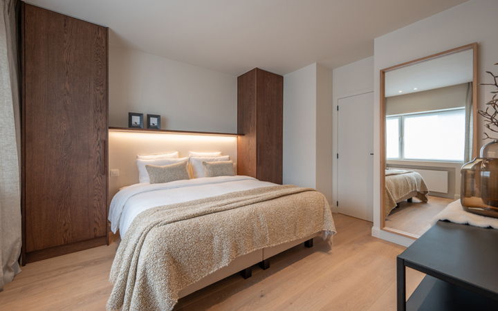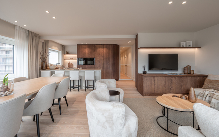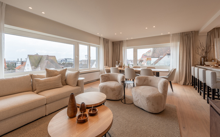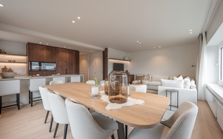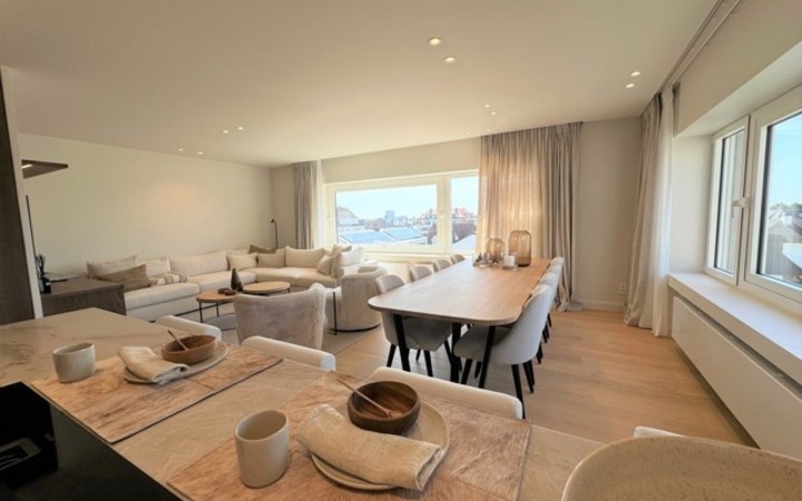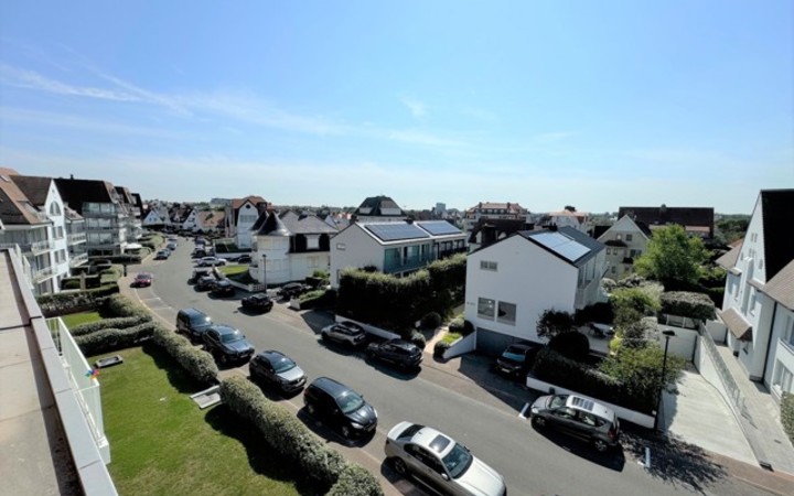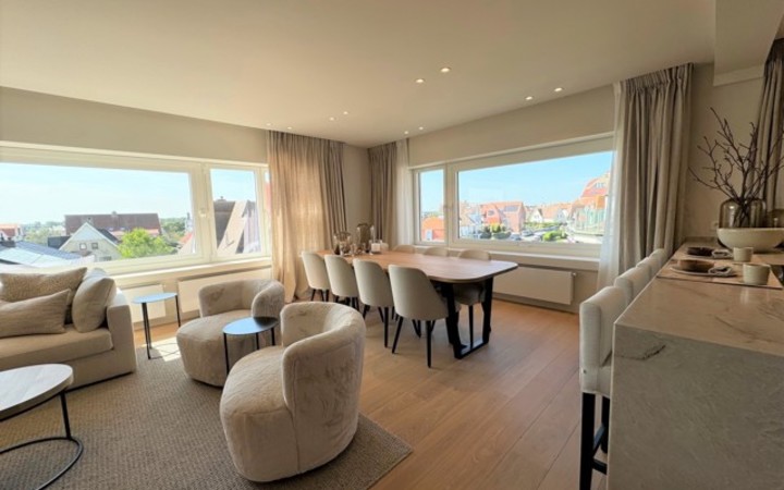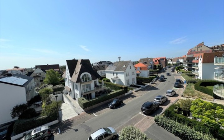 Smaakvol gerenoveerd hoekappartement met veel lichtinval en open zicht over de villa’s van Duinbergen, op wandelafstand van de zeedijk. Indeling: inkomhal met vestiaire en wc. Lichtrijke leefruimte met veel raampartijen en open zicht. Royaal uitgeruste leefkeuken met Miele toestellen. Berging met was- en droogkast. 2de berging/technische ruimte. Hoofdslaapkamer met ingemaakte kasten en aansluitende douchekamer (inloopdouche, lavabo). 2de en 3de volwaardige slaapkamer met ingemaakte kasten waarvan 1 slaapkamer met ensuite douchekamer. Aparte douchekamer (inloopdouche, lavabo, wc). 5 fietshaken. Mogelijkheid tot aankoop van een autostaanplaats in de residentie alsook de meubelen. Bezoek gaarne na afspraak in één van onze kantoren.